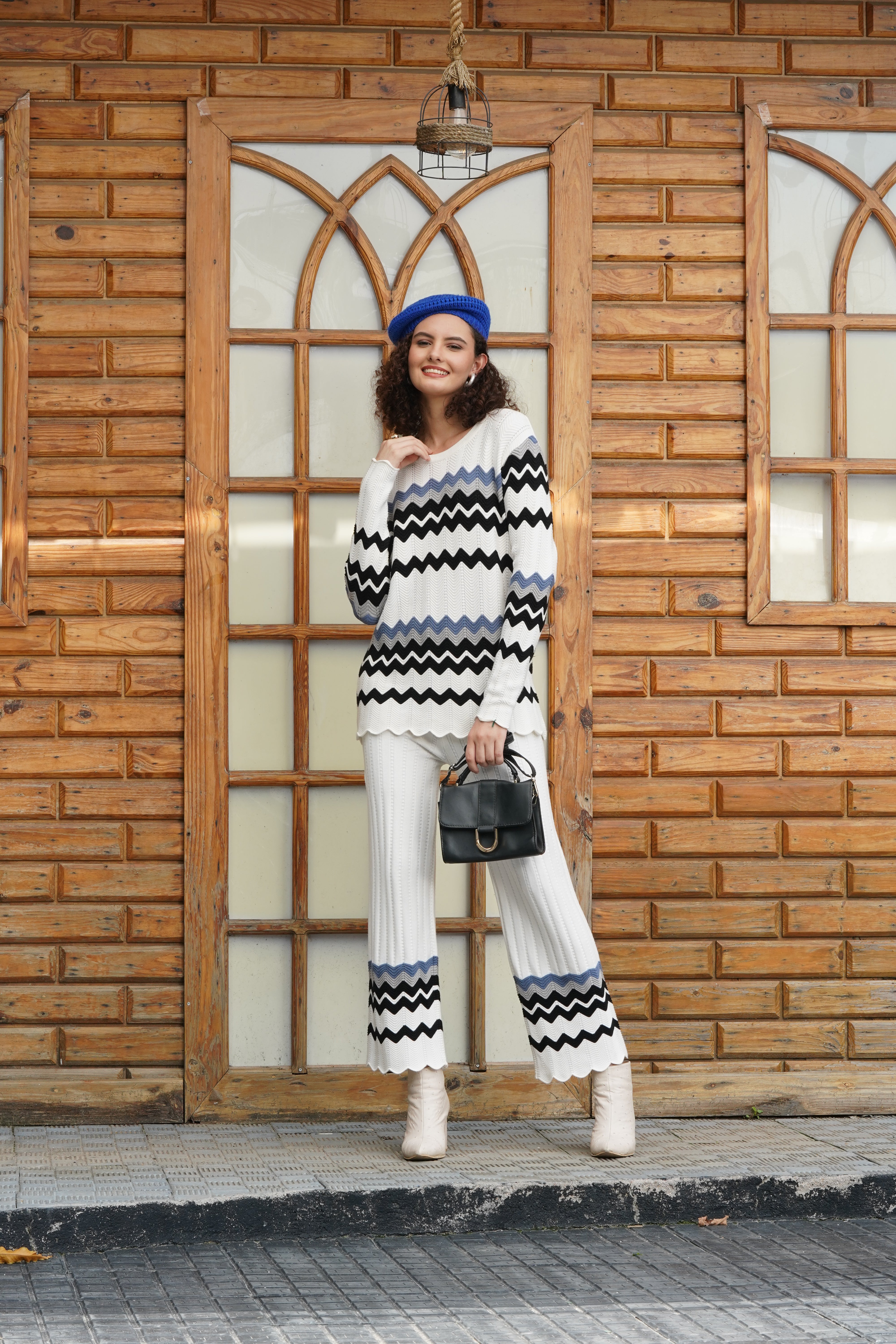 Elevate your everyday style with this cozy and chic two-piece knit set, designed for comfort without compromising on fashion. The set includes a long-sleeve sweater featuring a bold chevron pattern that adds a playful yet sophisticated touch to your look. Paired with matching wide-leg pants, this outfit offers a relaxed fit and soft, textured knit that feels as good as it looks. The ribbed detailing on the pants enhances their structure while providing stretch and ease of movement, making this set perfect for lounging at home or stepping out in style. Whether worn together or styled separately, this versatile set is a must-have addition to your wardrobe. Pair it with ankle boots and your favorite accessories for a look that transitions effortlessly from day to night. Ideal for chilly days, casual outings, or travel, this ensemble combines warmth, style, and practicality in one fashionable package.