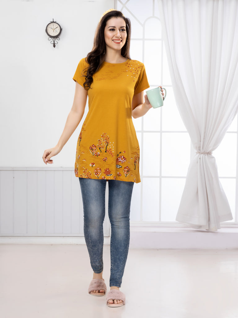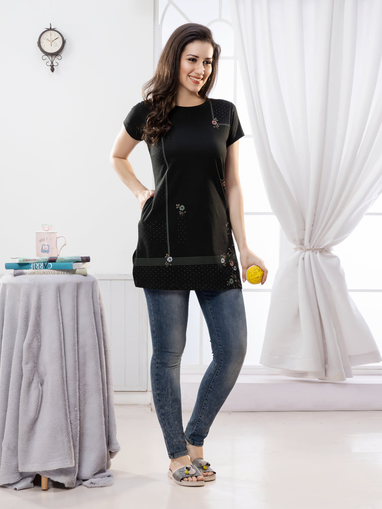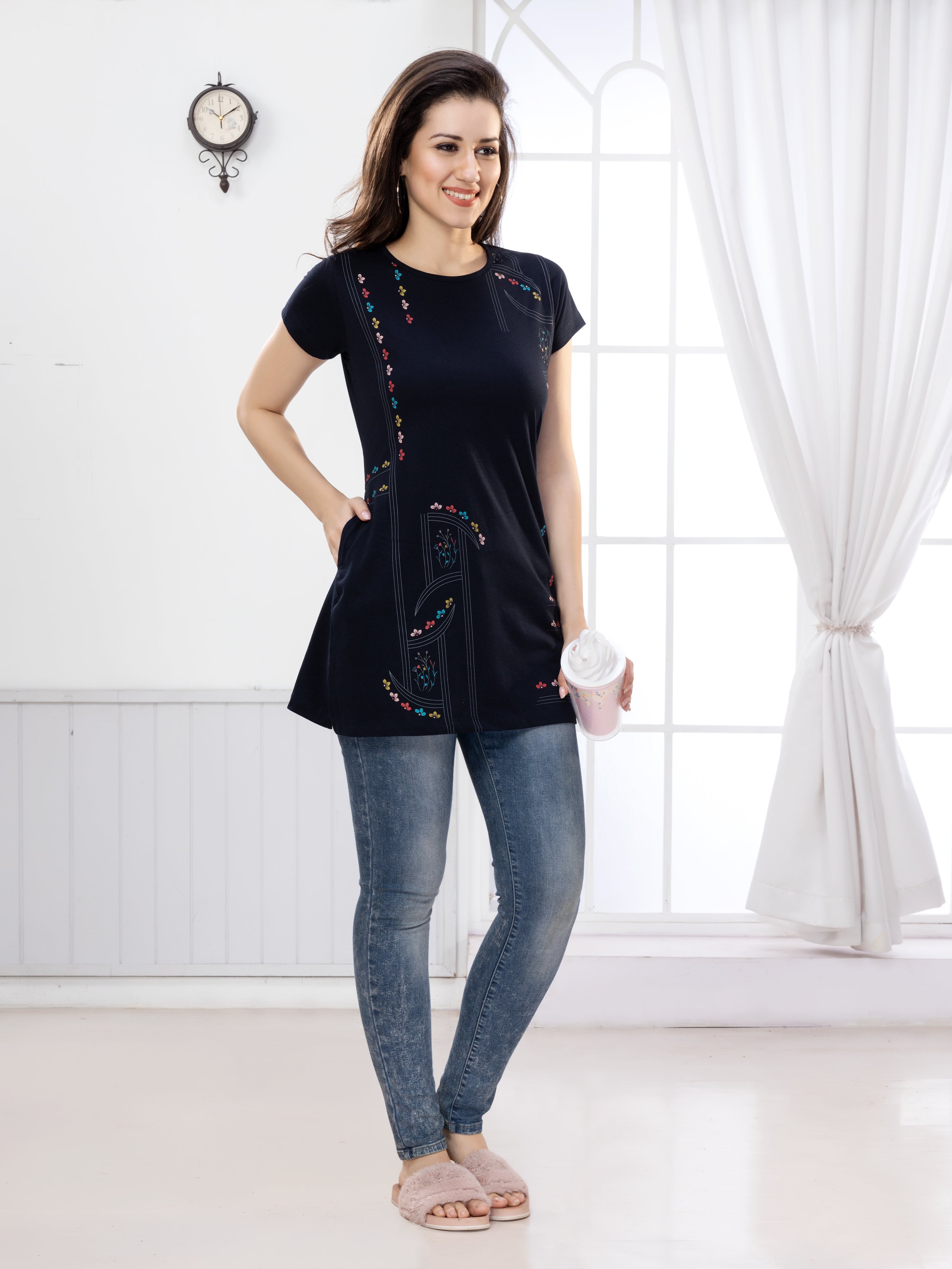 This short sleeve kurti-style top features a classic round neck and convenient side pockets, blending style with practicality. Designed for casual wear, it offers a comfortable fit while maintaining a fashionable silhouette. Ideal for daily use, this women’s top combines ease and elegance effortlessly.